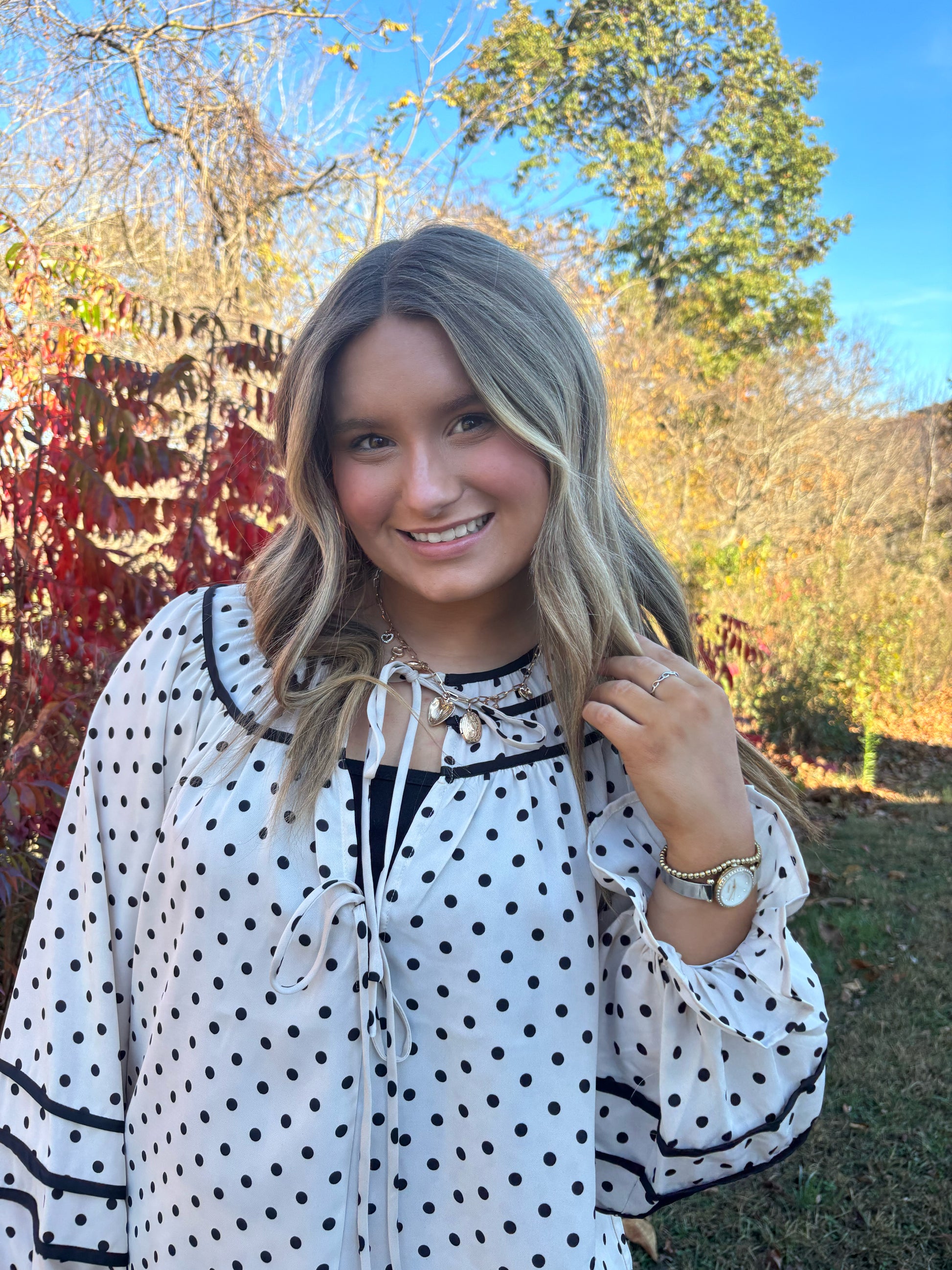 Take your wardrobe to the next level with our Black Dot Elegance blouse! A must-have for any fashion-forward individual, this top features a sophisticated dot pattern and eye-catching contrast binding detail. Elevate your style and confidence with this unique and elegant piece!