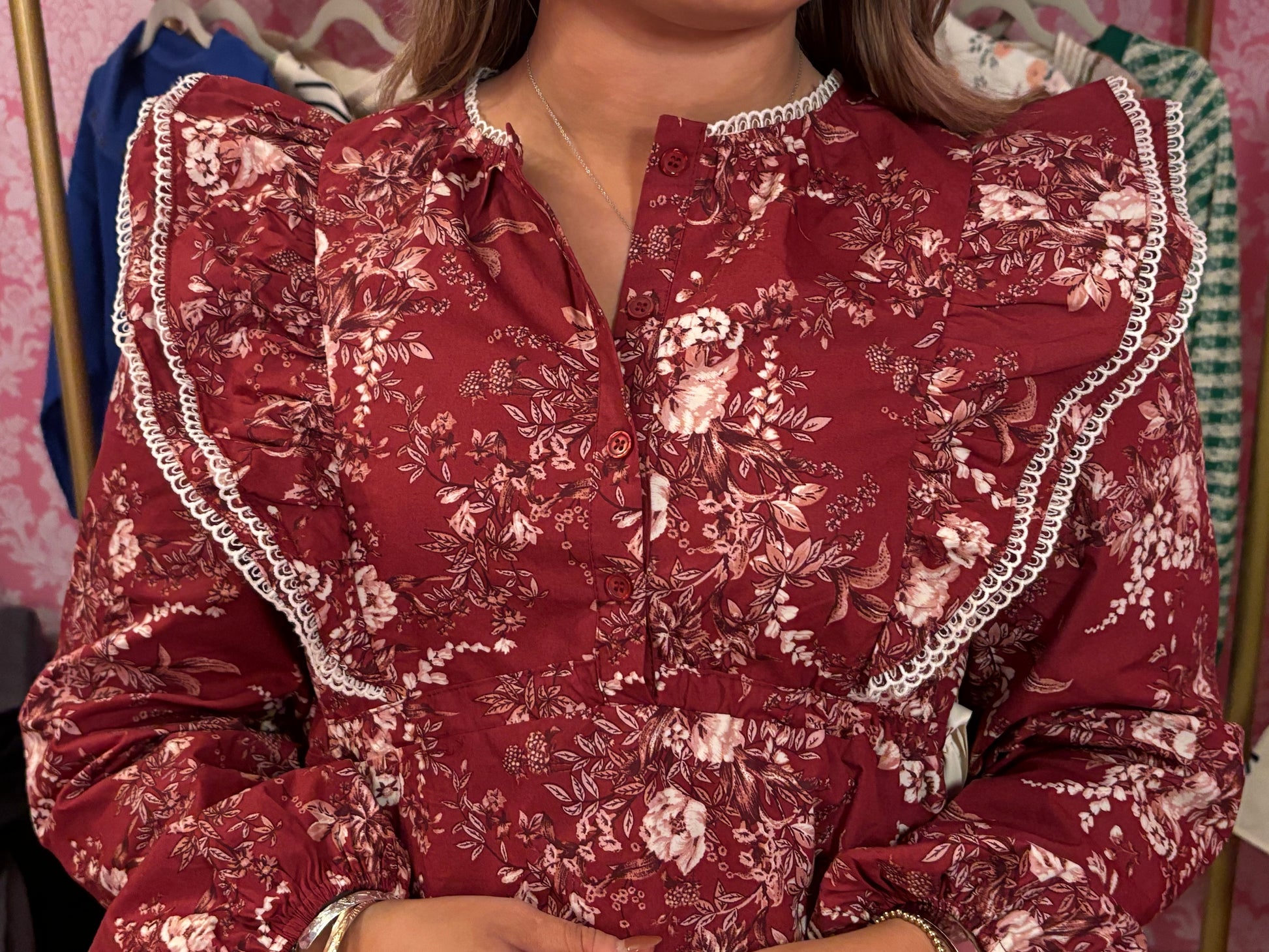Elevate your style with our Crimson Lace & Ruffle Top! The floral print and ruffle detail add a touch of femininity, while the adjustable satin drawstring allows for a personalized fit. Complete with a delicate scalloped lace neckline and button front, this babydoll blouse is the perfect addition to your wardrobe. Fit is true to size! Waist can be adjusted!Â