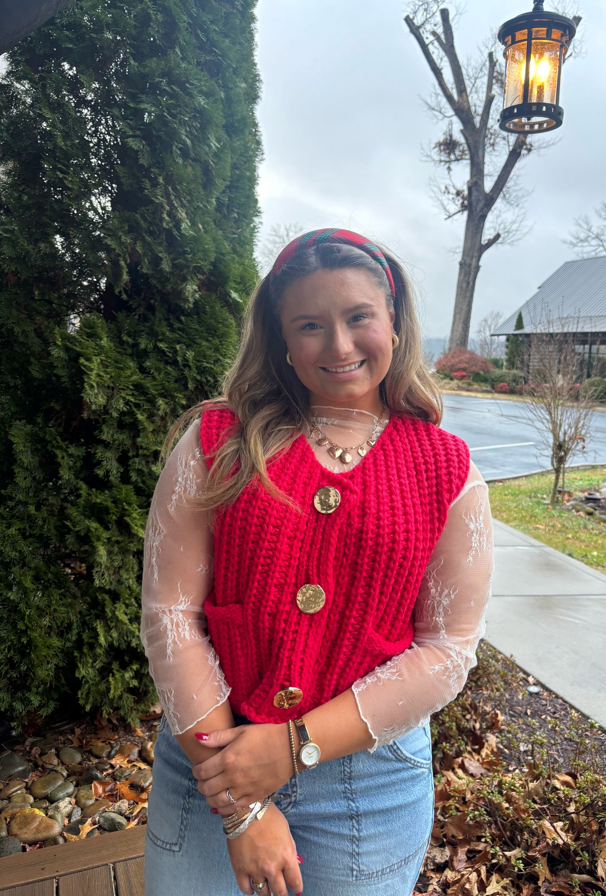 Made with a solid round neck design and accented with gold buttons, this sleeveless vest is both stylish and functional. The patched pocket adds a touch of convenience while the chunky knit provides warmth and comfort. A must-have for any wardrobe. Paired with the pure lace top!